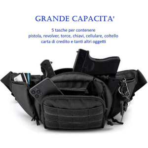 - Marsupio progettato per il trasporto nascosto di armi, in cui l’arma può essere posizionata sul lato destro o sinistro. Si adatta a quasi tutte le armi, dalle pistole compatte, medie e grandi ai revolver. Qualità: realizzato in nylon 1000D leggero ma resistente e dotato di tasche con cerniere robuste e durevoli che impediscono strappi e aperture durante l’uso.